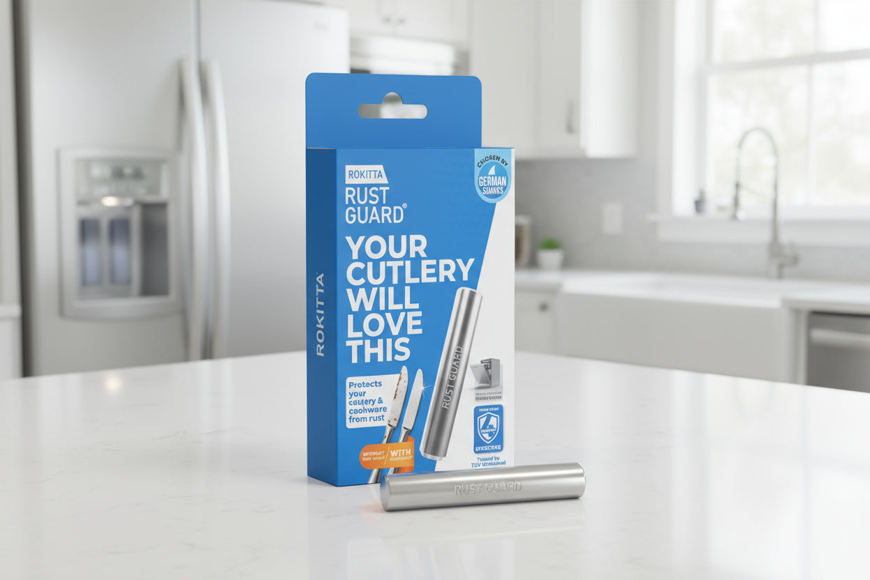 The Rust Guard utilizes the principle of a sacrificial anode: it is made of aluminum, a base metal that specifically attracts rust-causing particles before they can settle on your cutlery.